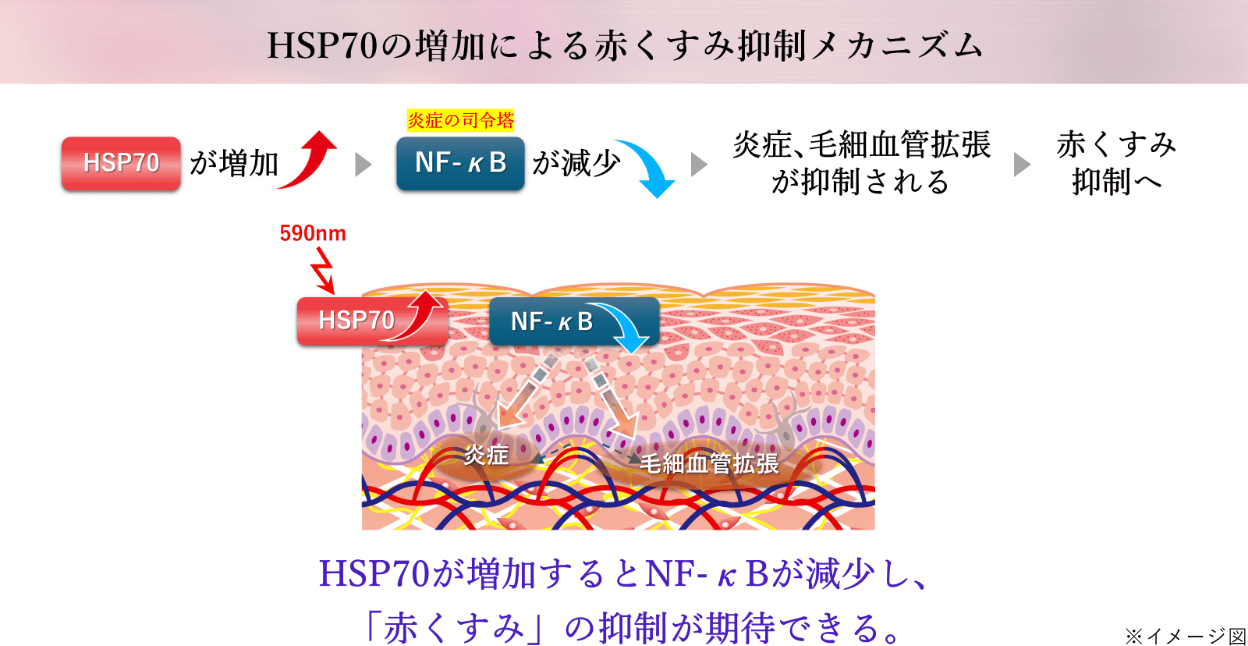 HSP70 を増やすことで炎症による赤くすみの抑制効果が期待できます。